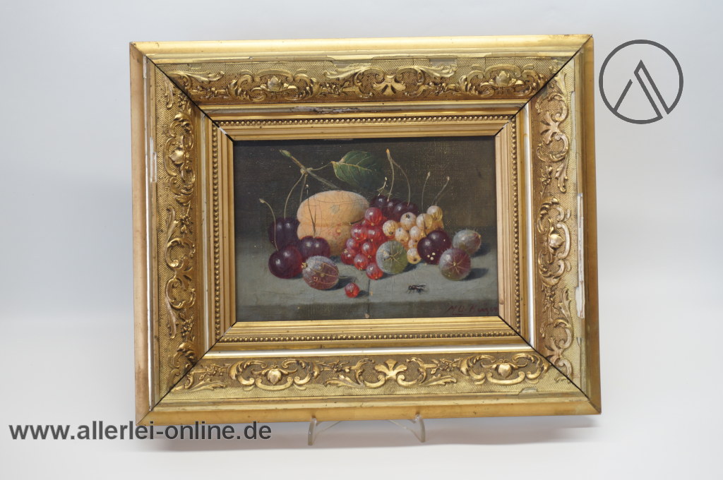 Artikel: Antikes Stillleben Ölgemälde | Obst Gemälde mit Fliege | Öl auf Leinwand – Signiert ,gerahmt 32 x 26,5 cm