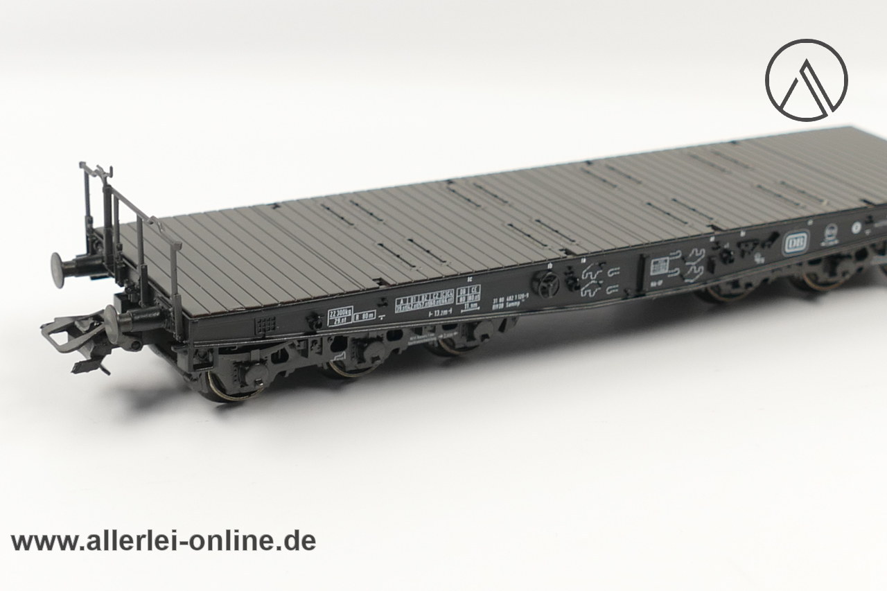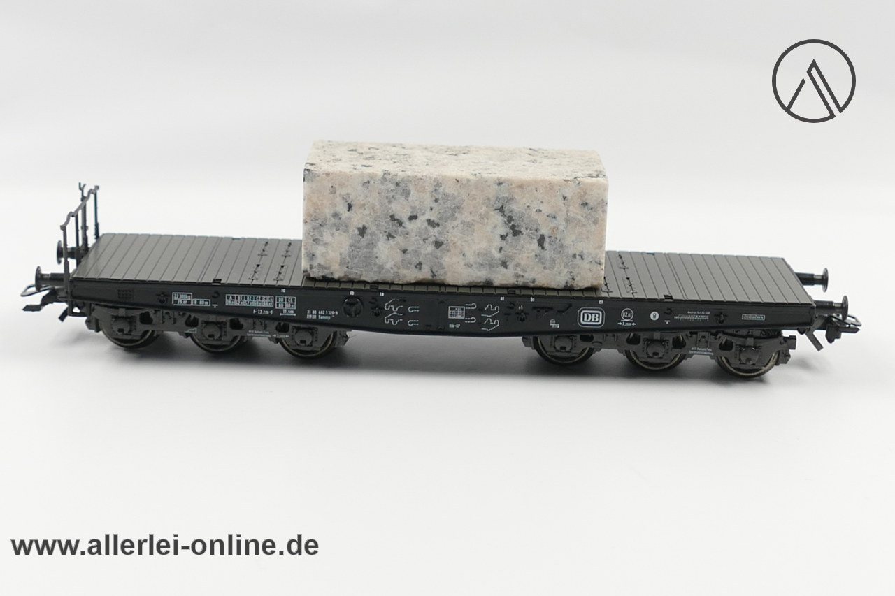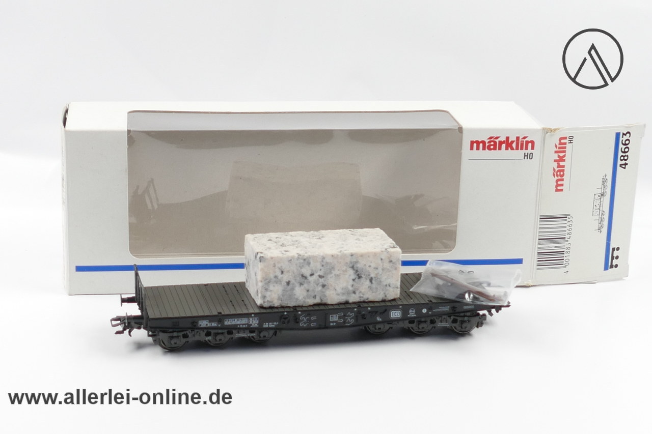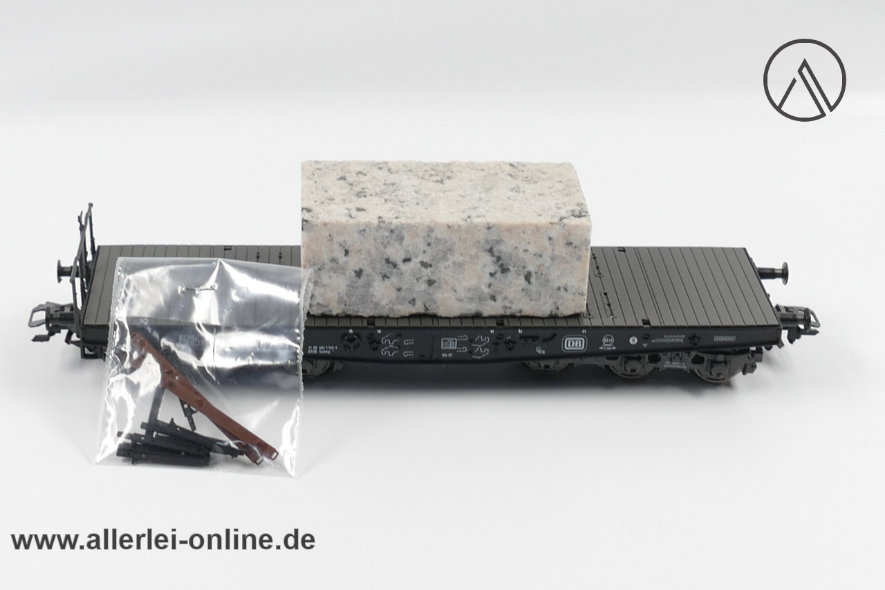 Lieferumfang: 1 Stück Märklin Spur H0 | 48663 Schwerlast-Flachwagen mit Granit-Block | 6-Achsiger Schwerlastwagen mit OVP ,wie abgebildet – Zurüstbeutel mit Rungen beiliegend