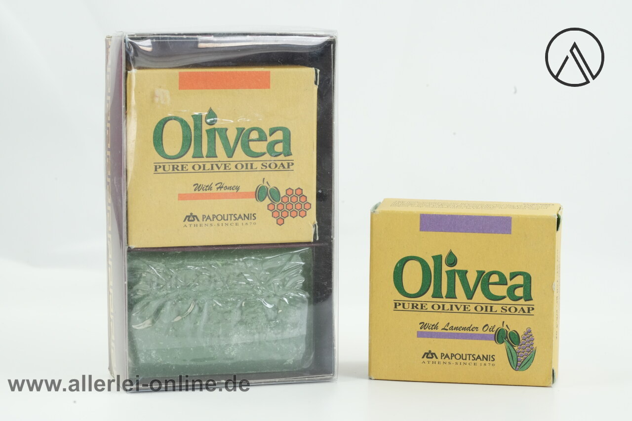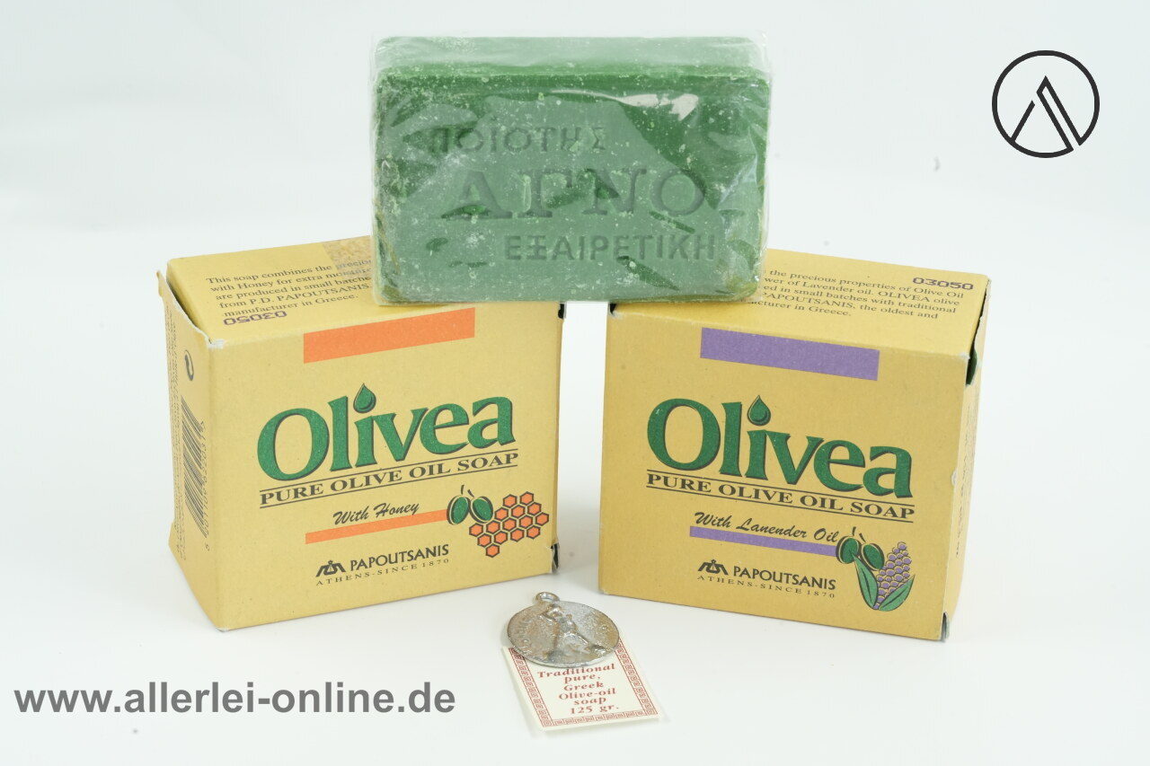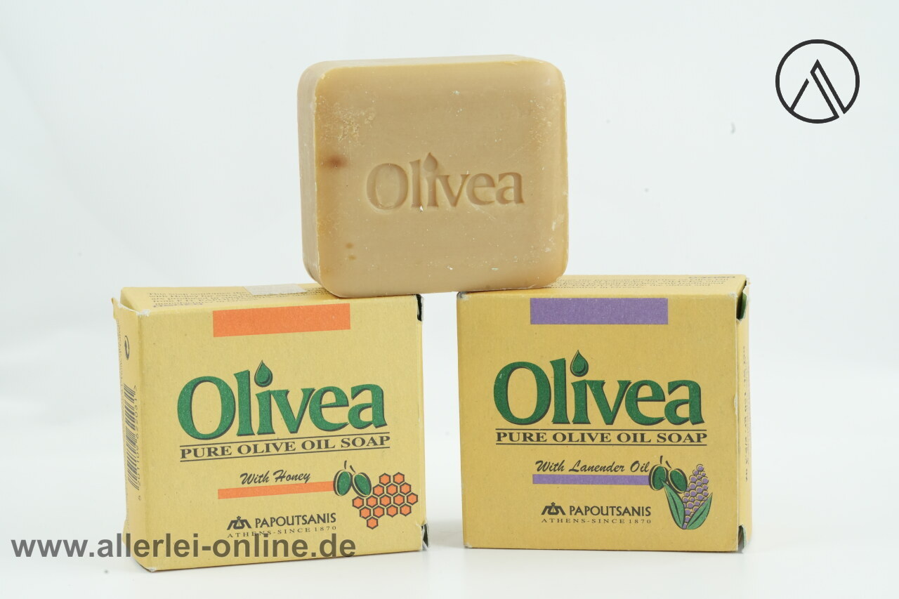 Artikel: Olivea Papoutsanis | Pure Olive Oil Soap | 1x Lavendel Öl 150gr. 1x With Honey 150gr. 1x grüne Olivenöl 125gr.